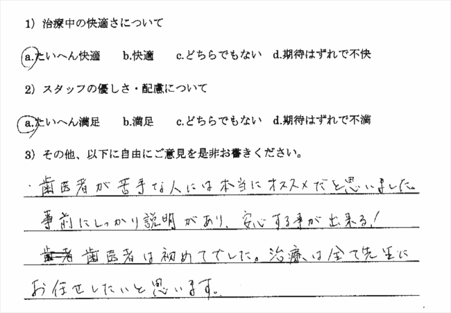 とにかく歯医者が苦手で、いつも限界になるまで行かないのですが、こういった方法があると知ったことで、今後は安心して通うことができそうです。定期検診もしっかりとやっていきたいと思います。先生をはじめとしてスタッフの皆さん、とても感じがよく、治療中もこまめに声をかけてくださったので、とても安心でした。