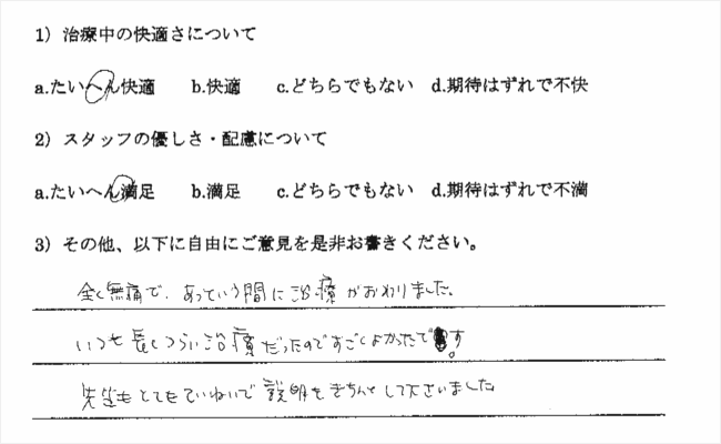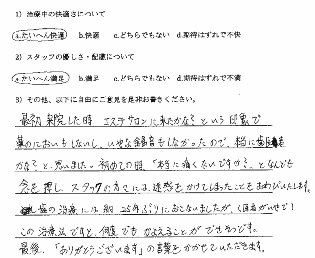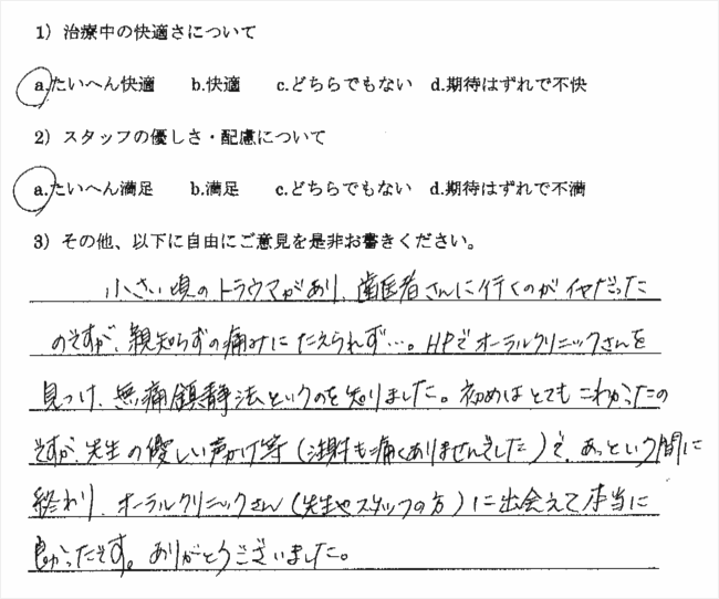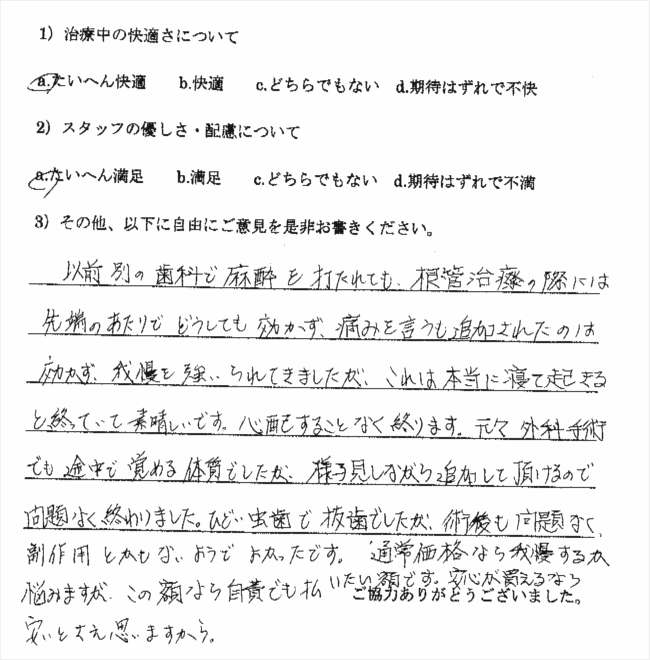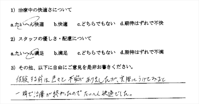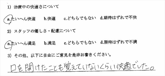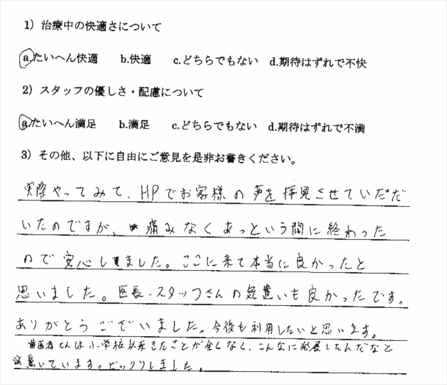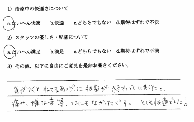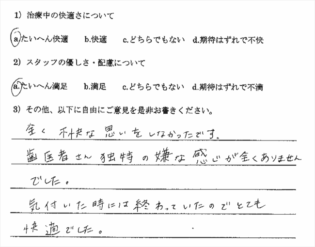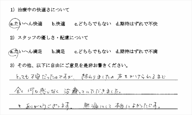 以前、やはり無痛治療を宣伝していた歯科医院に行ったところ、まったく麻酔が効かず大変でした。今回も多少でも楽であればいいと思い受診したのですが、もう最高でした。