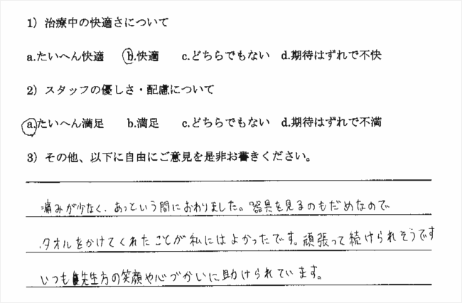 痛みが少なく、あっという間におわりました。器具を見るのもだめなので、タオルをかけてくれたことが私にはよかったです。頑張って続けられそうです。