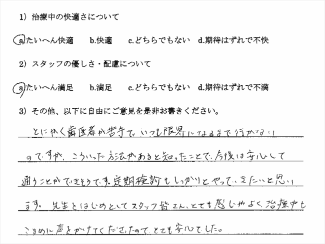 今までの歯科治療への恐怖心から、なかなか歯医者へ行く事ができませんでした。HPでこちらを見つけ、極度に恐怖心が強い自分でも、無痛鎮静法で安心して治療を受ける事ができました。勇気を出して来院して本当に良かったです。