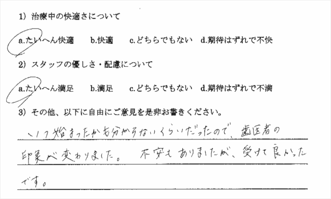 他院で受けたトラウマもありビクビクしていましたが、歯医者に対するイメージが変わりました。