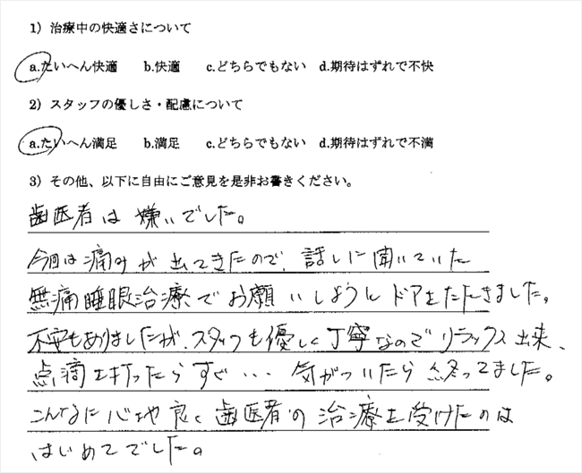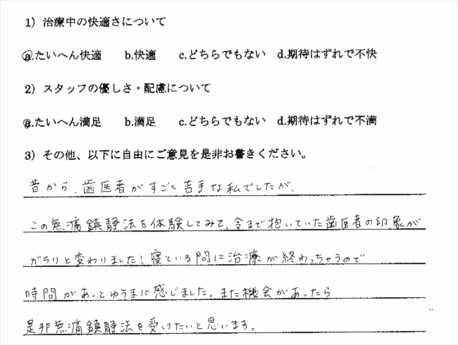 昔から、歯医者がすごく苦手な私でしたが、この無痛鎮静法を体験してみて、今まで抱いていた歯医者の印象がガラリと変わりました!寝ている間に治療が終わっちゃうので時間があっというまに感じました。また機会があったら是非無痛鎮静法を受けたいと思います。