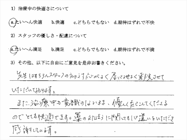 また、治療中も意識のないまま、優しく起こしてくださるのでとても快適です。薬の処方に関しても心遣いをいただき感謝しています。