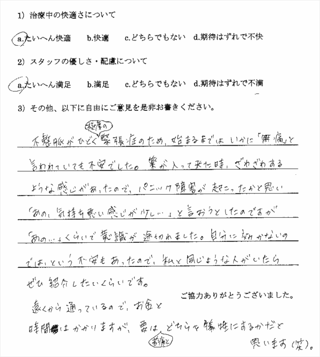 不整脈がひどく極度の緊張症のため、始まるまでは、いかに「無痛」と言われていても不安でした。